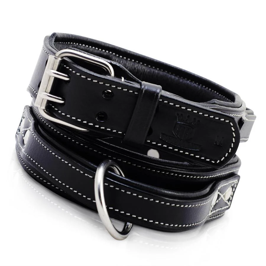 Deze lederen halsband met handvat is gemaakt het beste kwaliteit tuigleer. Het stiksel zijn versterkt met metalen studs en onze lederen halsbanden zijn gemaakt van een dusdanige kwaliteit om een hondenleven lang mee te gaan.